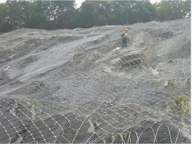 護坡網(wǎng)作用原理上類似于噴錨和土釘墻等面層護坡體系,但因其柔性特征能使護坡網(wǎng)系統(tǒng)將局部集中荷載向四周均材質:鋼絲繩網(wǎng)、普通鋼絲格柵(常稱鐵絲格柵)和TECCO 高強度鋼絲格柵 勻傳遞以充分發(fā)揮整個護坡網(wǎng)的防護能力,即局部受載,整體作用,從而使護坡網(wǎng)系統(tǒng)能承受較大的荷載并降低單根錨桿的錨固力要求 。